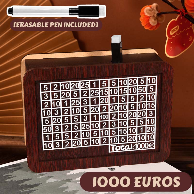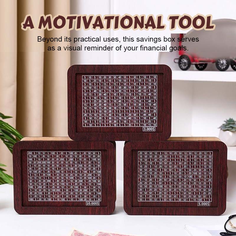 - 1 x tirelire numérique en bois (avec objectifs d'épargne imprimés)